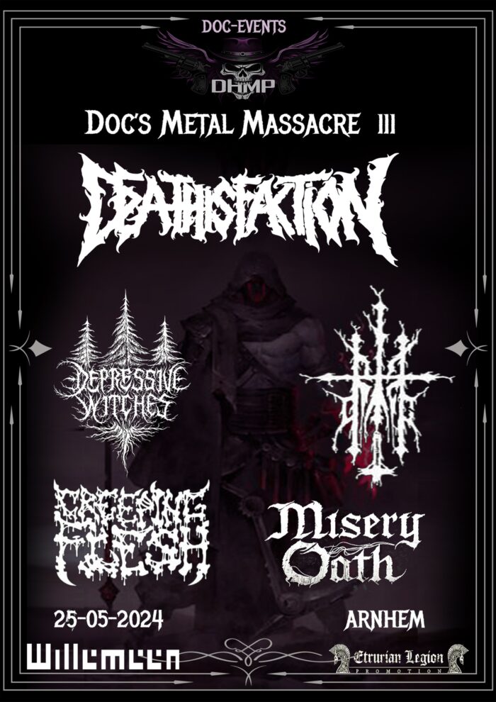 Kom naar een vette metal avond waar death en black elkaar afwisselen, uit lokale hoek hebben we DEATHISFACTION die onlangs hun geweldige debuut plaat hebben afgeleverd, aangevuld met blackened death van Depressive Witches uit Frankrijk, Black metal met een twist van OLD BLACK ook uit Frankrijk. Misery Oath en Creeping Flesh vullen het geheel aan met hun Swedish Old Skool Death Metal !!